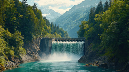 A captivating view of a waterfall cascading over a dam, nestled within a lush green forest and breathtaking mountain ranges. A perfect nature escape.
