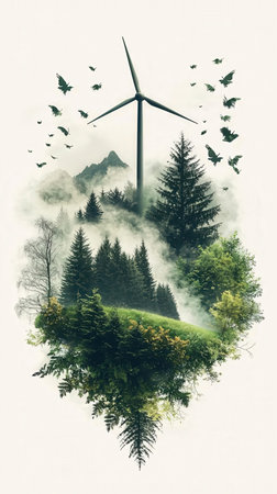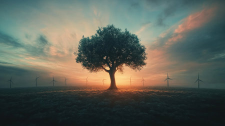 Captivating scene of wind turbines set against a dramatic sky, showcasing sustainable energy amidst a rugged landscape. Perfect for environmental themes.