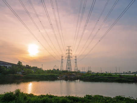 Power plant silhouette At sunset, a high-voltage tower stands against the sky. Electrical transmission wires from the bottom.
