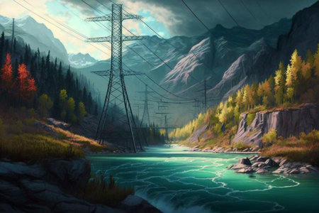a pink-blond sky casts a misty gothic ambiance over electricity towers nestled amidst beautiful trees. this scene captures the essence of romanticized depictions of wilderness, with a moody and evocative color palette. the topographic photography style, combined with digital enhancements, creates a visually stunning image reminiscent of british topographical art and the unreal engine 5. ai generated