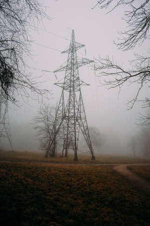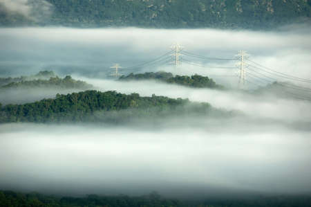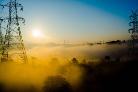 High voltage power transmission towers in fog on mountain mae moh lampang.