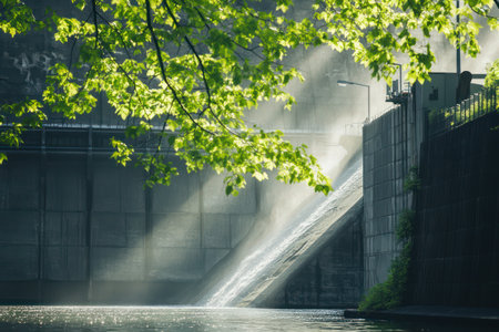 A powerful dam surrounded by green trees under clear sunlight, showcasing clean energy, infrastructure, and environmental harmony.