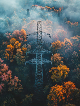 Aerial view Transmission tower in green forest and beautiful morning smooth fog. Energy and environment concept. High voltage power poles. Pang Puay, Mae Moh, Lampang, Thailand.