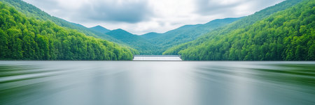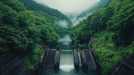 A captivating view of a dam surrounded by a lush green forest, veiled in mist. This serene landscape embodies tranquility and the beauty of nature, inviting reflection.