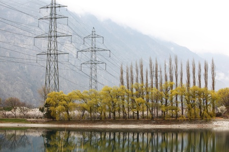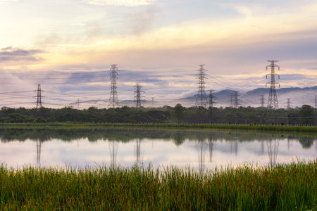 High-voltage transmission towers on the hill with reflection in the morning tranquil Mae Moh Lampang.