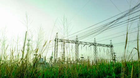 Electricity substation with green grass field in the morning light, Transmission line of electricity to rural field, Electricity tower with green nature landscape