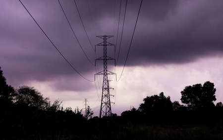 A stunning visual display of lightning striking power lines against a vibrant purple sunset, capturing the raw power and beauty of nature.
