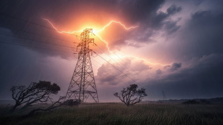 An electric transmission tower stands against a stormy sky, illuminated by a brilliant lightning strike. The image features a dramatic composition, showcasing dark clouds and an atmospheric interplay of light and shadow. Potential uses include editorial illustrations or environmental concepts.