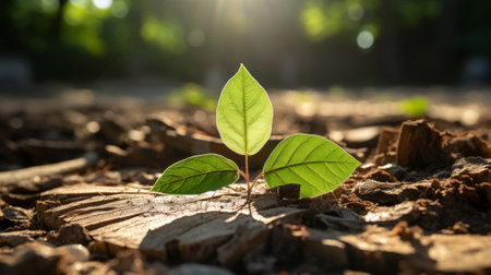A close-up captures a small plant emerging from rough, textured wood. The image features a shallow depth of field, with soft focus in the background and bright sunlight. The composition emphasizes growth and resilience, suitable for various editorial and commercial projects.