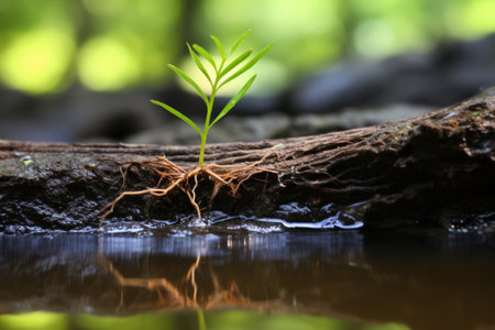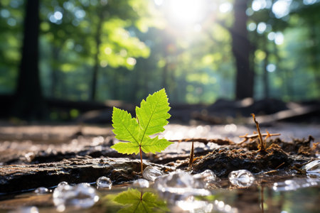 close up of a rescued fallen leaf sprouting new roots in water, created with generative ai