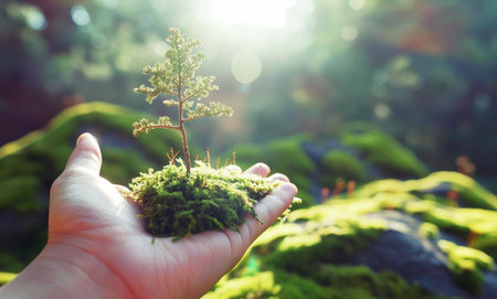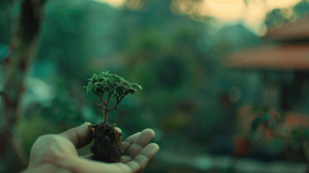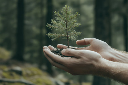 A person holds a small tree with green and yellow leaves, symbolizing growth and a commitment to environmental protection for generations future.