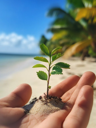A delicate tree sprouts from a hand, representing the importance of caring for nature on a tranquil beach under a sunny sky.