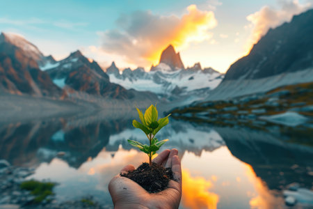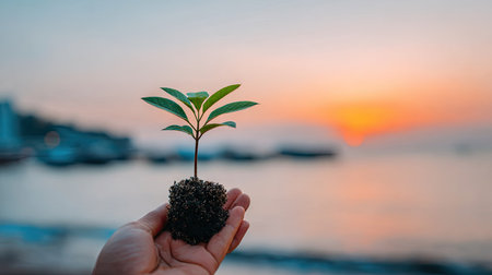 A hand cradles a young plant, showcasing a symbol of growth. The image features a shallow depth of field, with soft focus on the plant against a colorful sunset. The composition likely aims to evoke themes such as hope, nature, or environmental sustainability, useful for various commercial and illustrative projects.