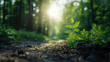 Photo of a small tree growing on moss at sunrise, symbolizing hope and new beginnings. Web banner with copy space on the right for product placement.