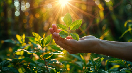 Hands presenting a small green plant growing from soil, representing sustainability, environmentalism, and growth. Bright colors emphasize hope and care for nature.