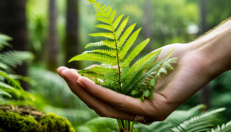 Fern on a womans palm. Fern leaf with plant texture and pattern. Ecology and health concept.
