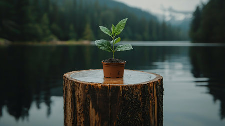 A young plant sprouts from an old tree stump in a serene forest, showcasing the beauty of nature's resilience and renewal amidst vibrant greenery.