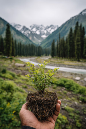 A close-up captures a hand holding a small plant with exposed roots and soil. The background features a mountain range with trees and a river. The composition uses natural light and a shallow depth of field, suitable for environmental or nature-related editorial and commercial projects.