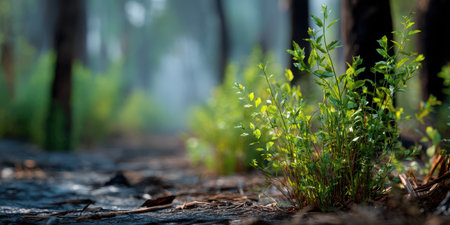 Young green saplings growing on forest floor with blurred trees in background, peaceful natural environment