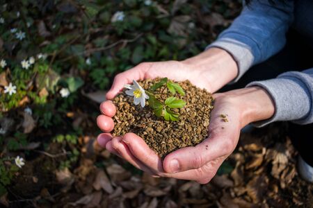 Closeup hands of person holding soil with young plant in hand for agriculture or planting nature concept