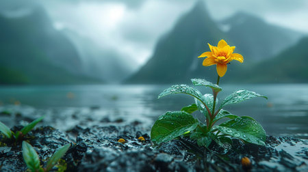 A bright yellow flower with dew drops stands out against a blurred, overcast mountain scene with falling rain.