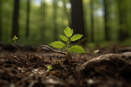 A hopeful and serene composition featuring a small green sprout emerging from dark soil, symbolizing growth and renewal in a natural environment.