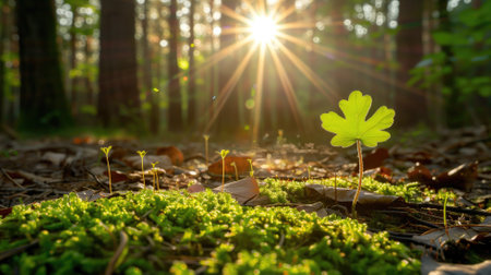 Sunlight Streaming Through Forest Canopy Illuminates Fresh Green Seedling Amidst Moss and Fallen Leaves in Vibrant Nature Setting