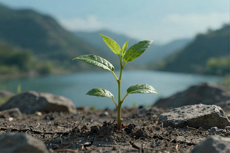 A small plant with green leaves emerges from river rocks, with the water flowing. The blurred background features trees and a mountain, showcasing a natural setting. The composition uses selective focus, highlighting the plant. This image can be used in various commercial and editorial applications.