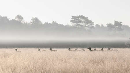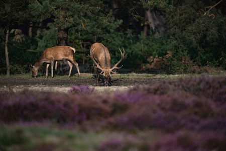 Red deer stag standing next to doe in rutting season. National Park Hoge Veluwe.