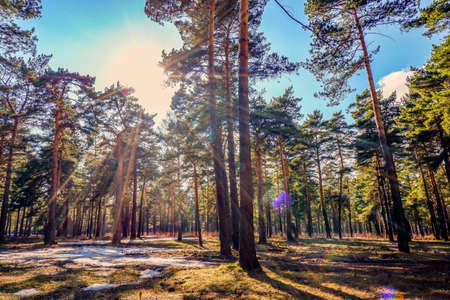 Beautiful landscape with pine trees in the forest. Vintage style.