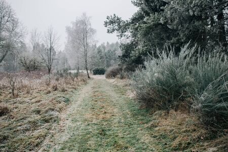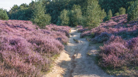 Sandy path through the heaths in the Veluwe National Park during sunset in The Netherlands