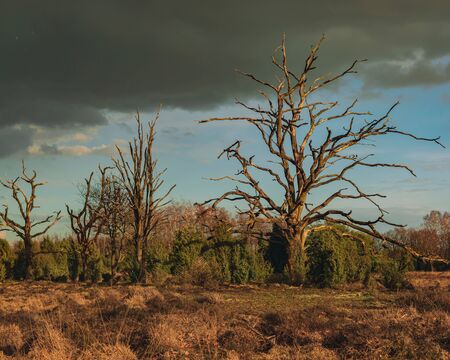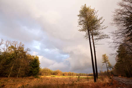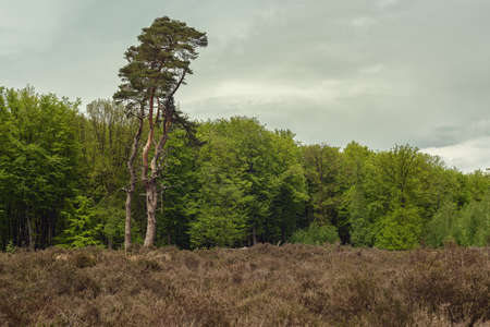 Forest edge with deciduous trees and a pine tree in a heath landscape under a dark cloudy sky.