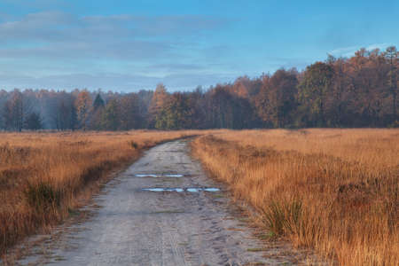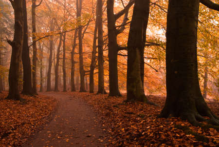 Mystical dark autumn forest with trail in blue fog. Landscape with enchanted trees with orange leaves on the branches. Scenery with path in dreamy old foggy forest. Fall colors. Nature. Vintage toning. High quality photo