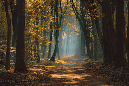 Magical and moody atmosphere, view between tree trunks with rays through sun and mist