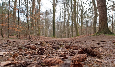 a clearing in the forest with pine cones scattered around, created with generative ai