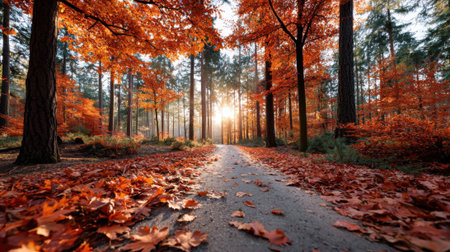 A serene forest path appears, illuminated by the soft glow of sunlight breaking through the trees. Vibrant orange and red leaves blanket the ground, creating a peaceful autumn atmosphere.