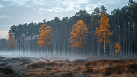 A beautiful tranquil forest clearing enveloped in soft fog, showcasing tall evergreen trees and gentle morning light, ideal for nature lovers and peaceful moments.
