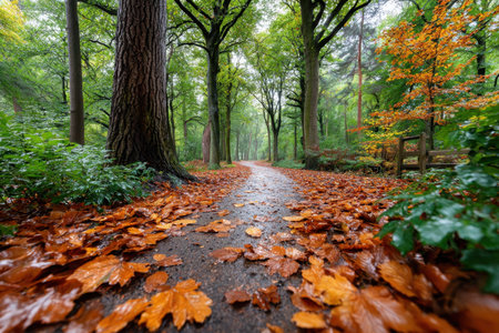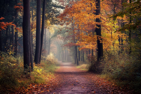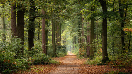 Discover a picturesque forest pathway enveloped by vibrant trees and the gentle touch of autumn leaves, creating a serene and tranquil atmosphere perfect for nature lovers.