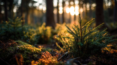 A tranquil forest scene captured during sunrise, featuring soft light illuminating lush green foliage and moss-covered ground, creating a peaceful natural environment.