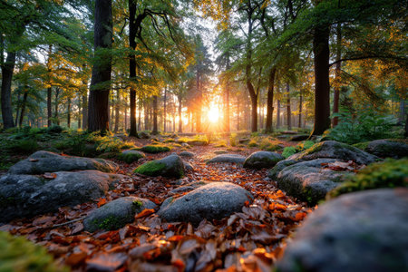 Autumn leaves cover mossy rocks in a forest at sunrise
