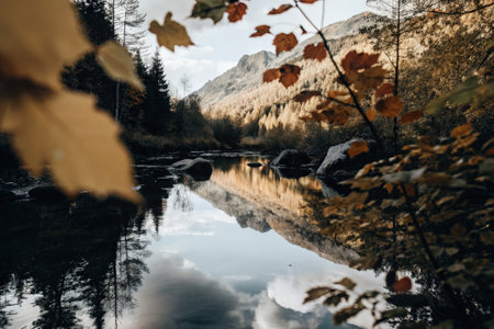 Tranquil mountain lake scene enveloped in mist showcases vibrant autumn foliage. A perfect escape into nature's harmony and a serene atmosphere for relaxation.