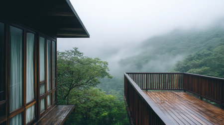 A tranquil wooden deck offers a stunning view of a misty forest, creating a serene atmosphere perfect for relaxation and escape into nature.