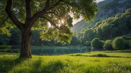 A lush green tree stands prominently in a verdant landscape under a bright sky. The scene features soft sunlight filtering through the trees, with birds soaring. The composition is balanced, showcasing a natural environment for various commercial or editorial applications.