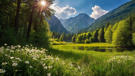 a stunning stock photo capturing the beauty of a sunrise as it shines through the mountains in a rocky landscape. this photo showcases sparkling water reflections, romantic riverscapes, and the breathtaking nature of norway. with its photo-realistic landscapes and pastoral scenery, this high-resolution image is perfect for those seeking a cabincore aesthetic or looking to enhance their visual content with 8k resolution. ai generated