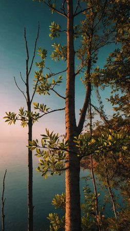 This serene image captures a quiet forest scene with a still lake reflecting the surrounding trees and misty mountains, evoking a sense of tranquility and peace.
