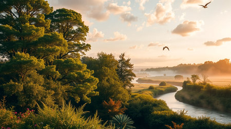 Tranquil river flows through a lush forest, with vibrant greenery and rocky banks creating a serene atmosphere, showcasing the beauty of nature and outdoor tranquility