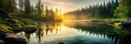 Discover the tranquil beauty of a serene forest lake, surrounded by towering evergreen trees and enveloped in mysterious fog. This peaceful scene invites reflection and relaxation in a captivating natural environment rich in greenery and calm waters.
