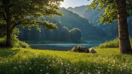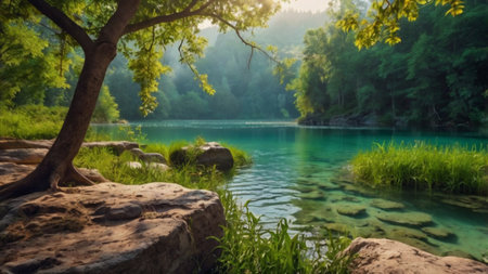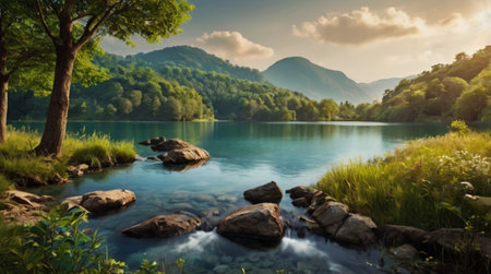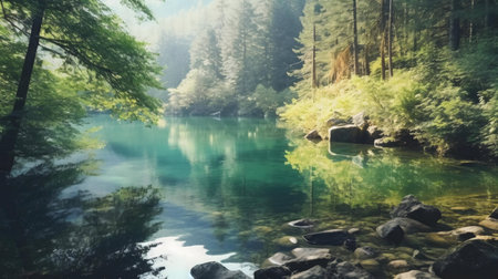 beauty of a tranquil lake, surrounded by lush greenery and mirrored reflections. Generative AI