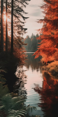 a serene lake with vibrant red, orange, and yellow fern leaves reflecting on its still waters. the hyper-realistic style captures warm colors, dynamic lighting, and a sense of peaceful solitude. perfect for a phone wallpaper, this vertical composition showcases highly detailed and high-resolution 16k imagery. ai generated