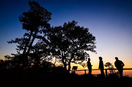 Silhouette of people watching the sun at dawn , Phu Kradueng National Park ,Thailand